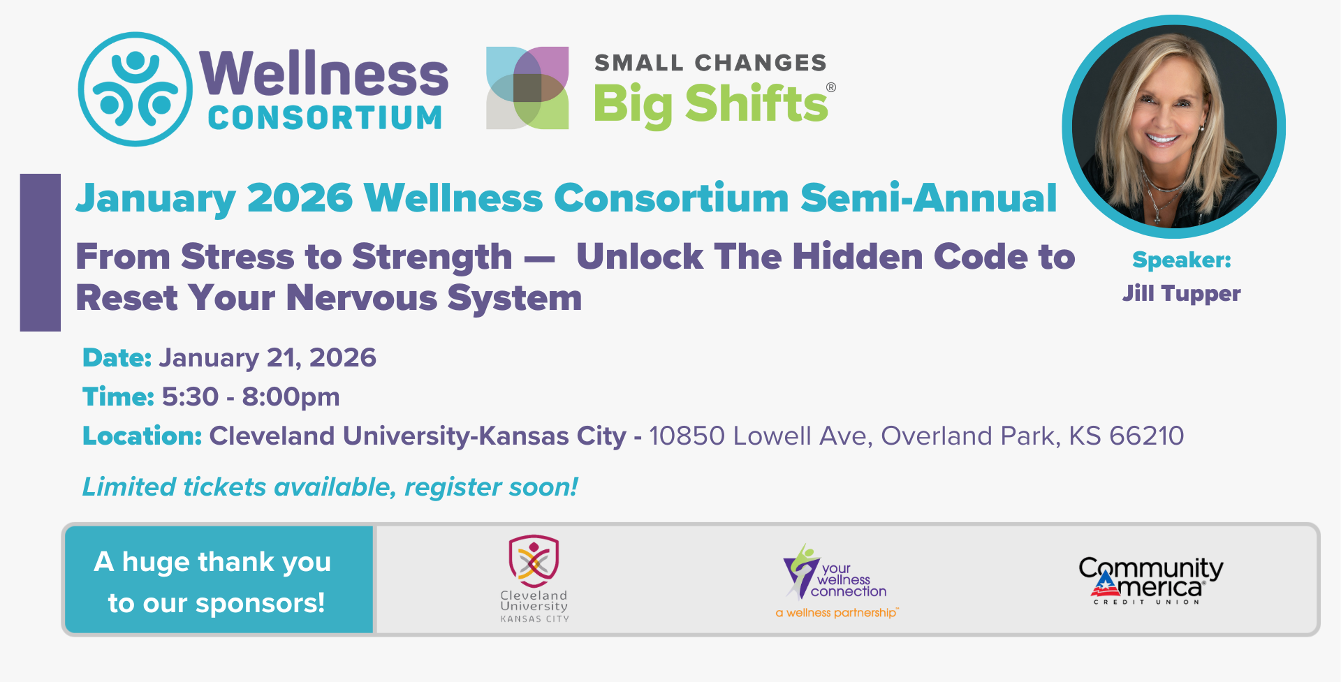 We’re excited to welcome keynote speaker Jill Tupper, who will share transformative strategies to turn stress into strength and build resilience. Following her keynote, she will lead an interactive workshop at Your Wellness Connection from January 29–31, 2026, offering a deeper dive into practical tools to navigate high stress, reset your nervous system, and cultivate calm, empowered living.
