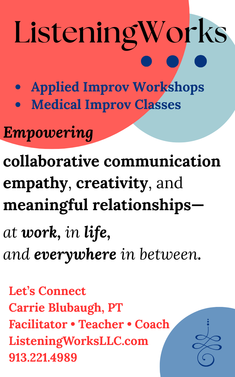 Carrie completed the Medical Improv Training with Katie Watson at the Northwestern School of Medicine in 2023. She has facilitated medical improv training with the Children’s Mercy Hospital residents and is an active member of the international Medical Improv Collaborative network. She teaches Medical Improv continuing education classes (CEUs) for healthcare professionals.