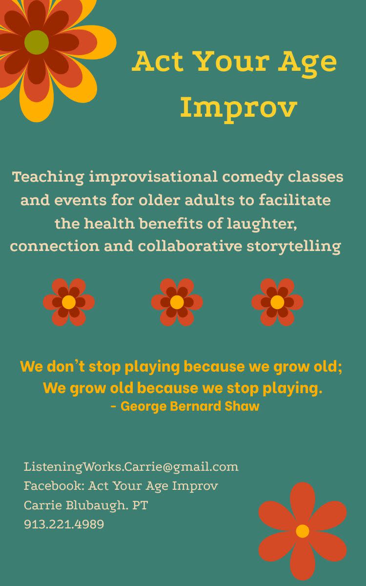 In addition to her clinical practice, Carrie is an accomplished improviser and has been performing in improv comedy shows for 12 years as well as teaching and coaching improv classes. Her business, Act Your Age Improv, brings improv classes and events to older adults in senior living communities, through Johnson County Parks and Rec 50+ program and the University of Kansas Health System Turning Point Center program.